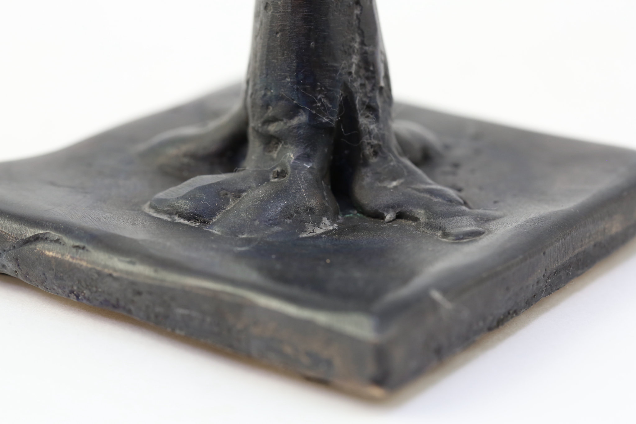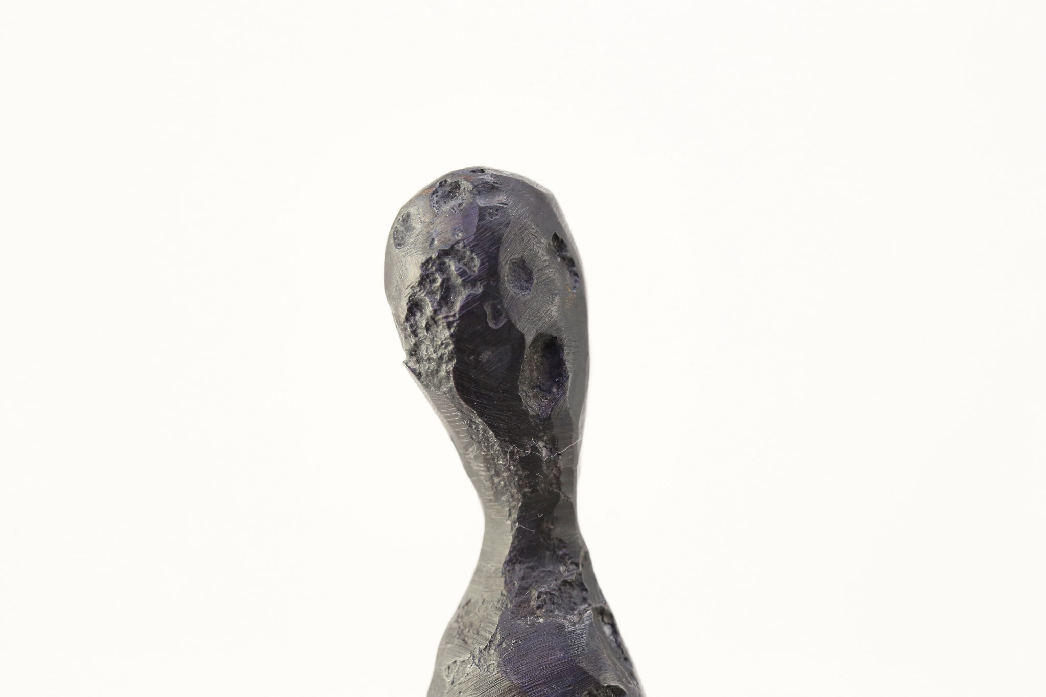 Skulpturen er støbt i bronze og efterfølgende patineret i en sort farve der giver figuren karaktér og en kraftfuld udstråling.