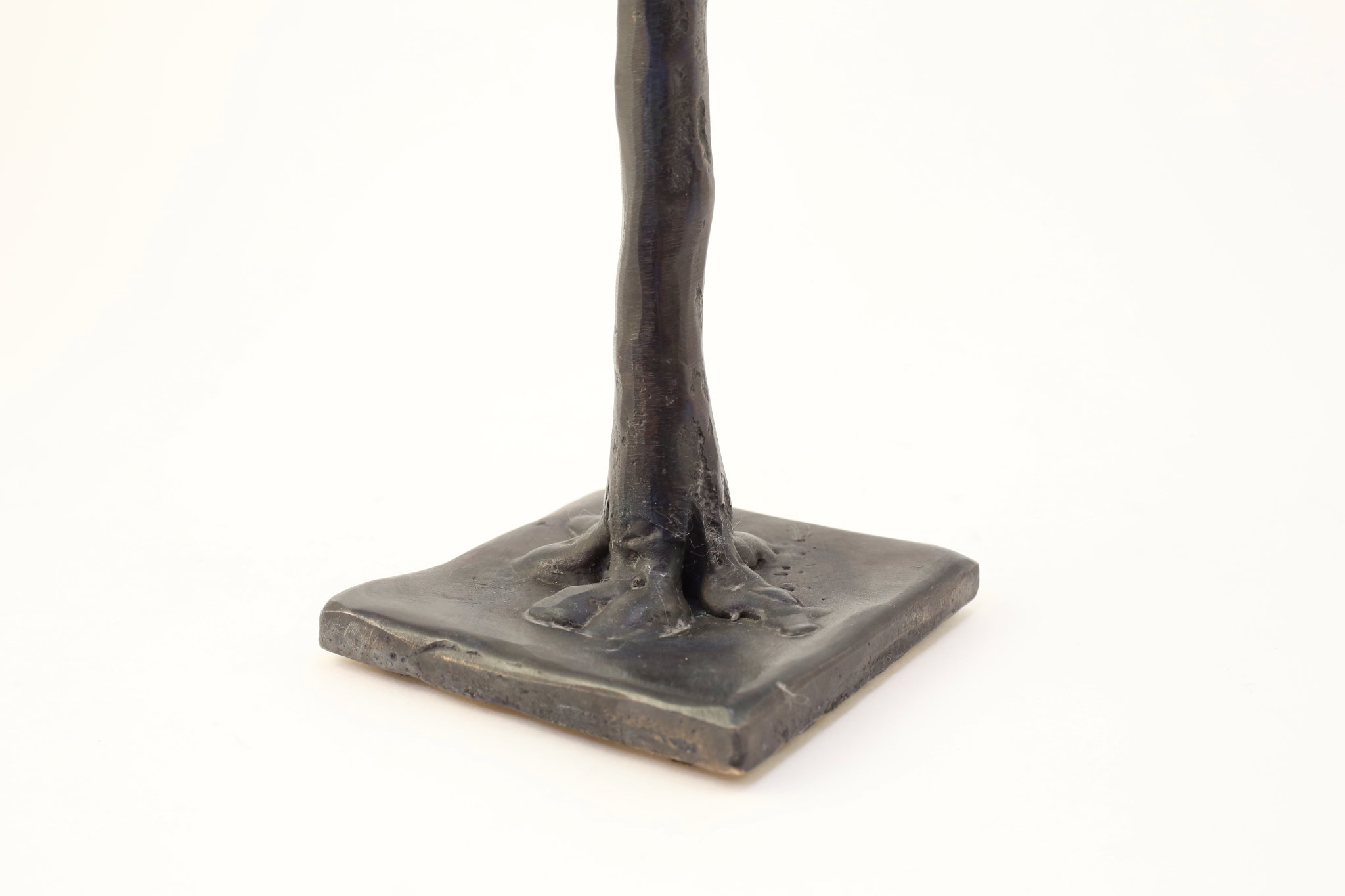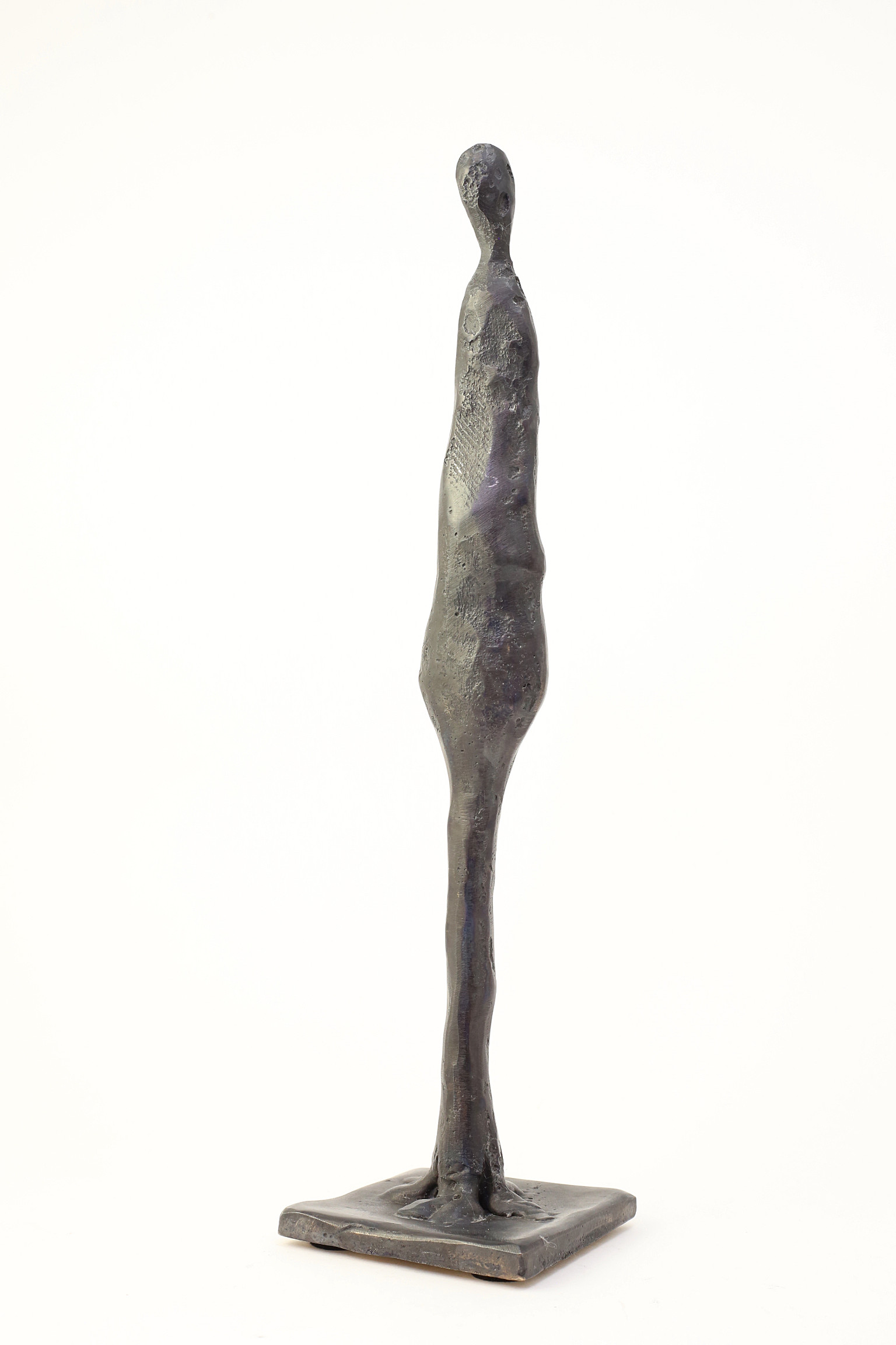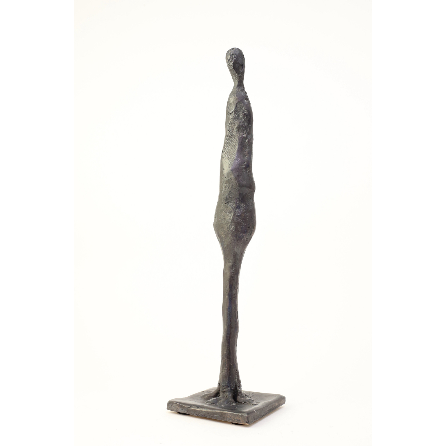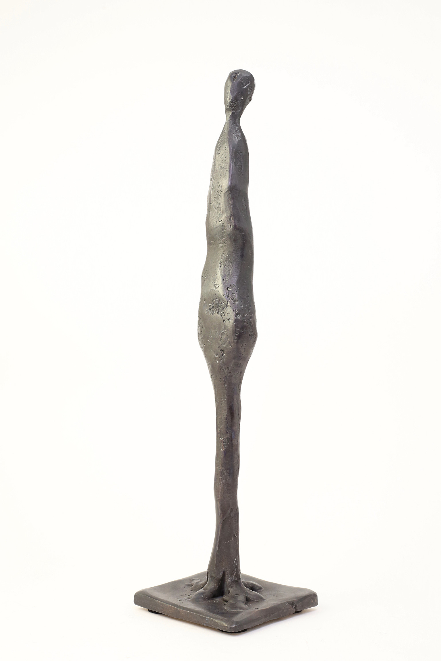 Sort og koncentreret figur i enkelt formsprog. Kvinde- eller mandeskikkelse. Figuren har et let bugtet forløb ned igennem kroppen. Står solidt på benenes søjleform og er godt forankret til jorden med sine solide rødder.