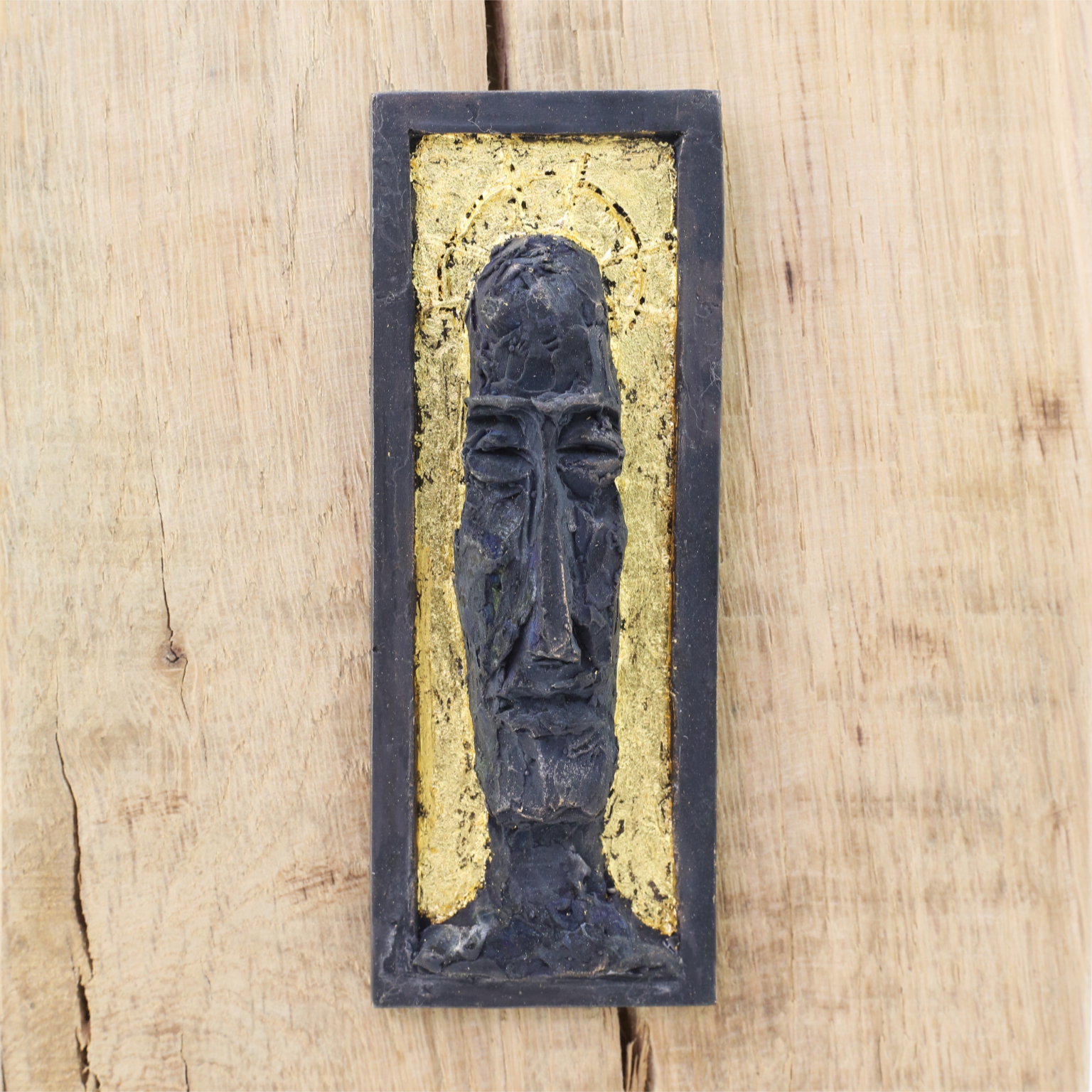 Overfladen på ikonramme og ansigt er i oxideret bronze. Baggrunden er belagt med 24 karat bladguld.
