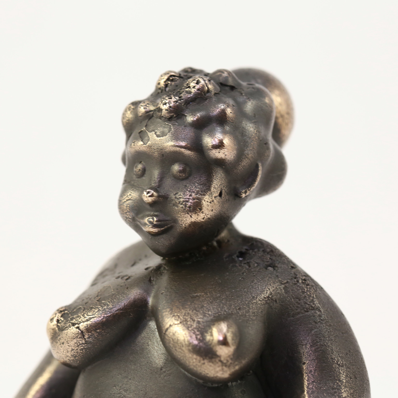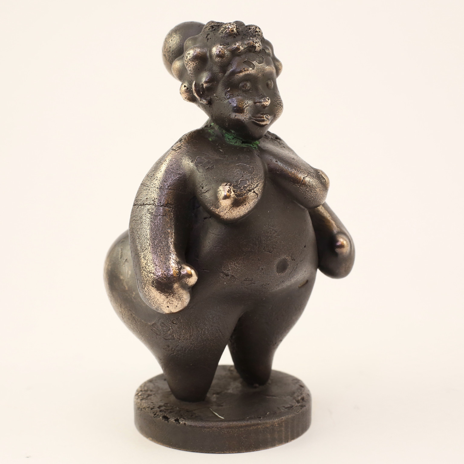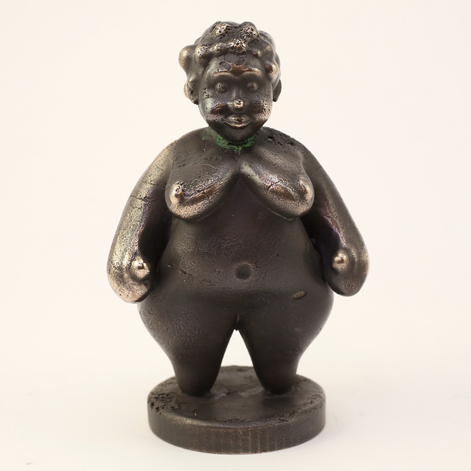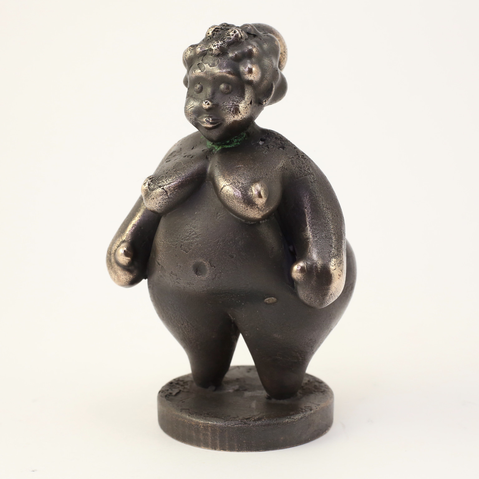 Figur af kvinde med skønne former, opsat hår og et glad udtryk i ansigtet.